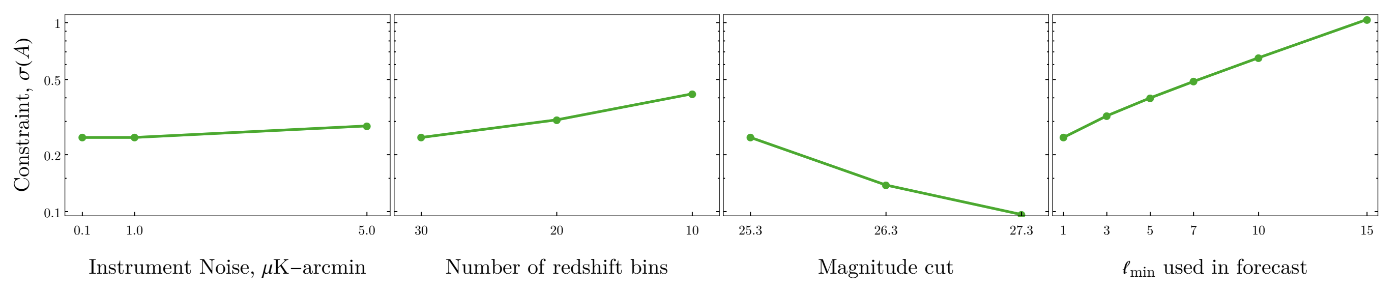 From Hotinli et al. (1908.08953). The impact of changing various survey parameters relevant for, or related to, cosmological experiments.
