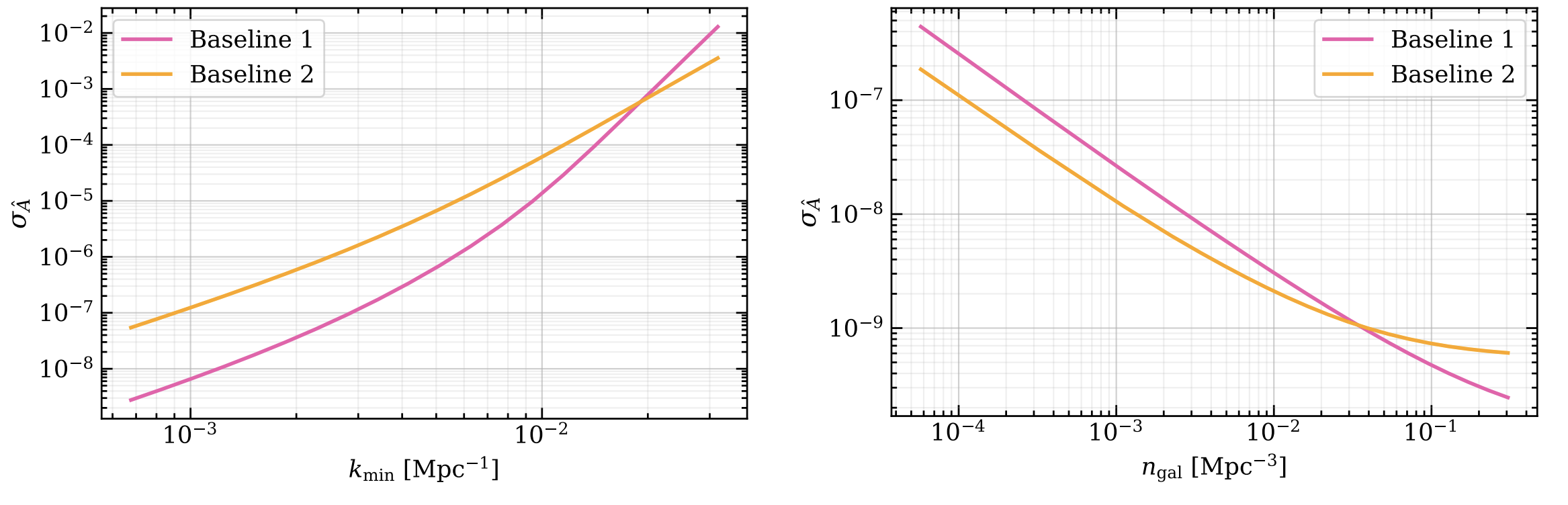 From Neha Anil Kumar et al. (2208.02829). Forecasted error on the primordial isocurvature amplitude after marginalizing over bias parameters as a function of largest scales (Left) and galaxy density (Right) considered in the analysis. Baseline I (II) corresponds to an LSST (DESI)-like galaxy survey.
