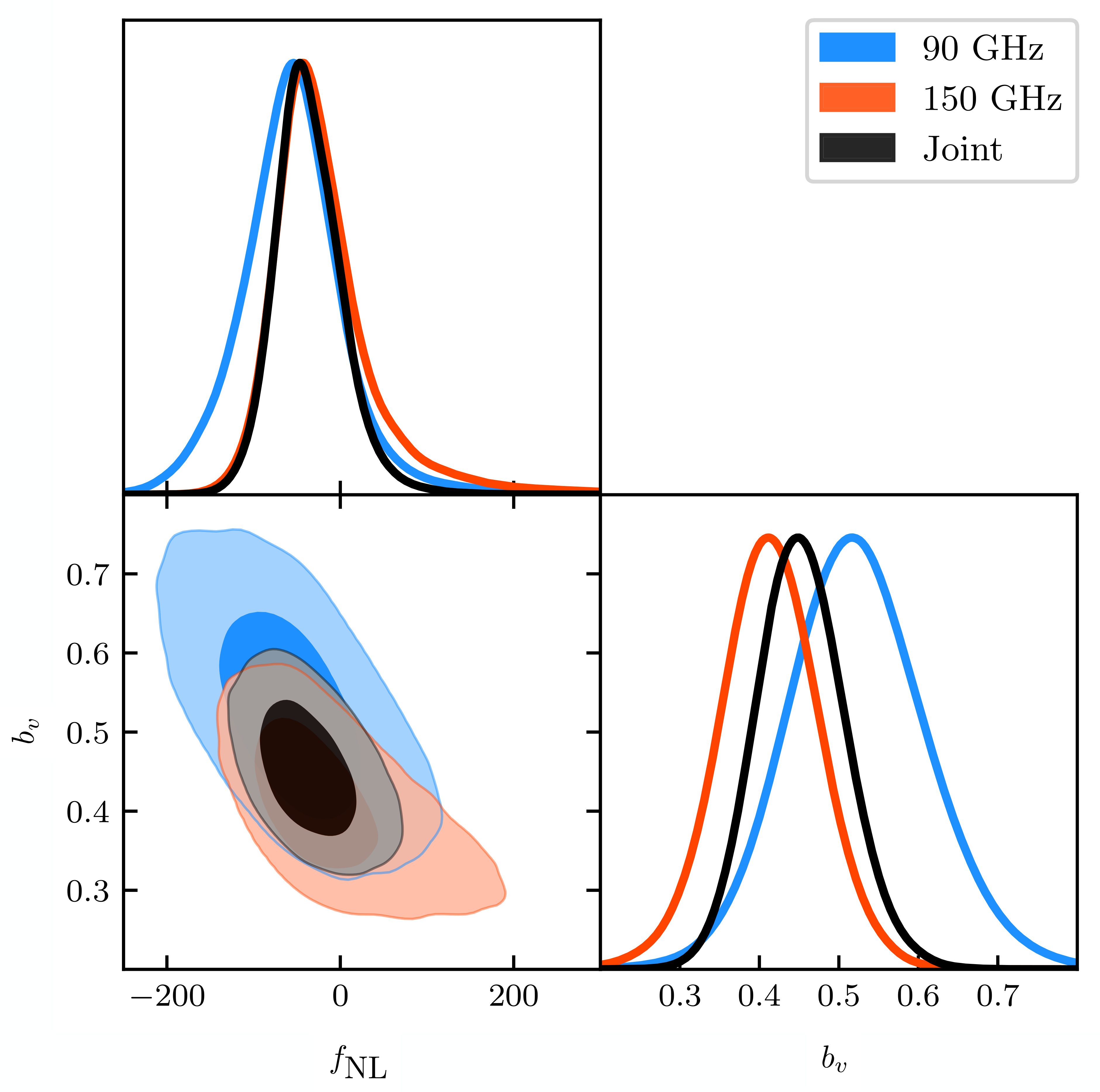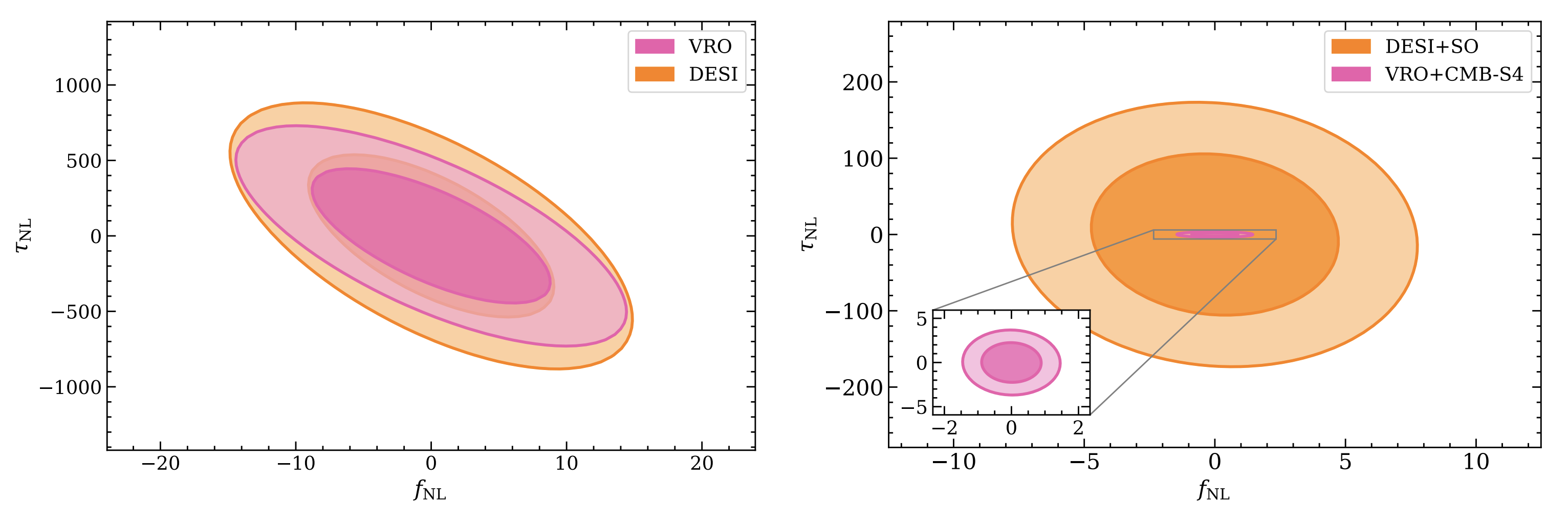 From Neha Anil Kumar et al. (2205.03423). Forecasted error ellipses on primordial non-Gaussianity signals at 68 and 95 percent confidence intervals, after marginalizing over bias parameters. Left: results when only galaxy survey data is considered. Right: results when velocity reconstruction data is added to the analysis.