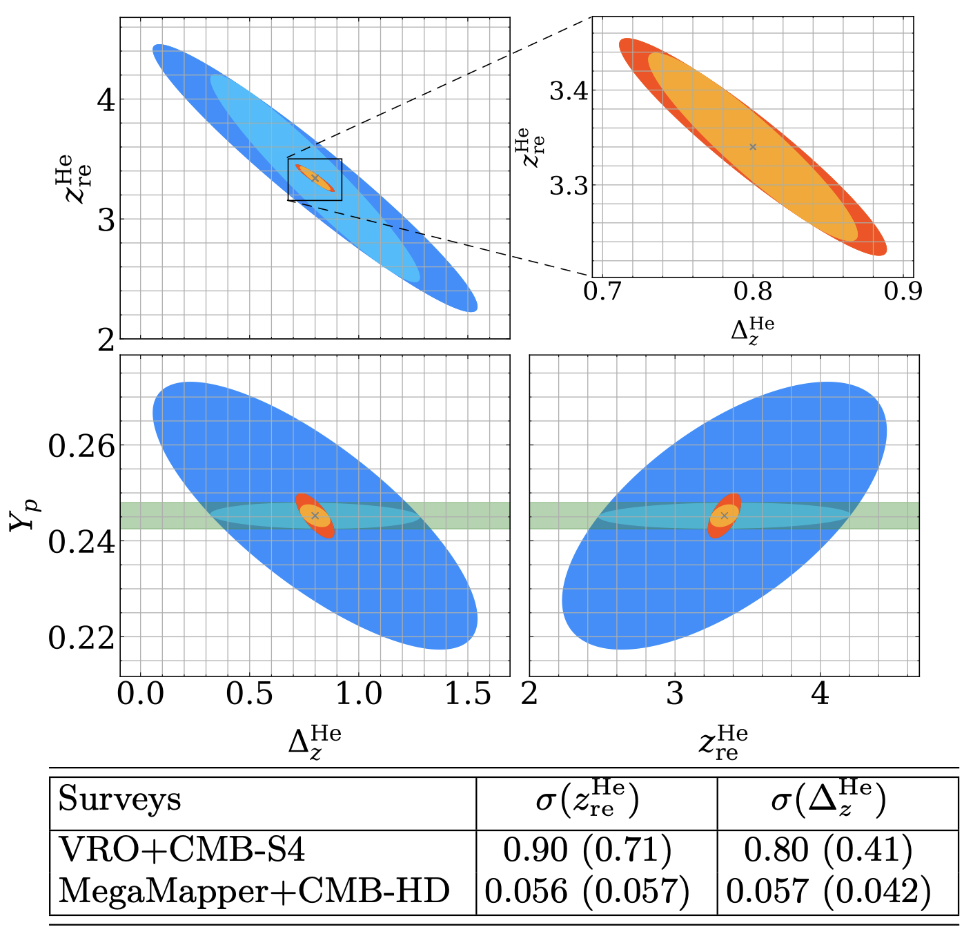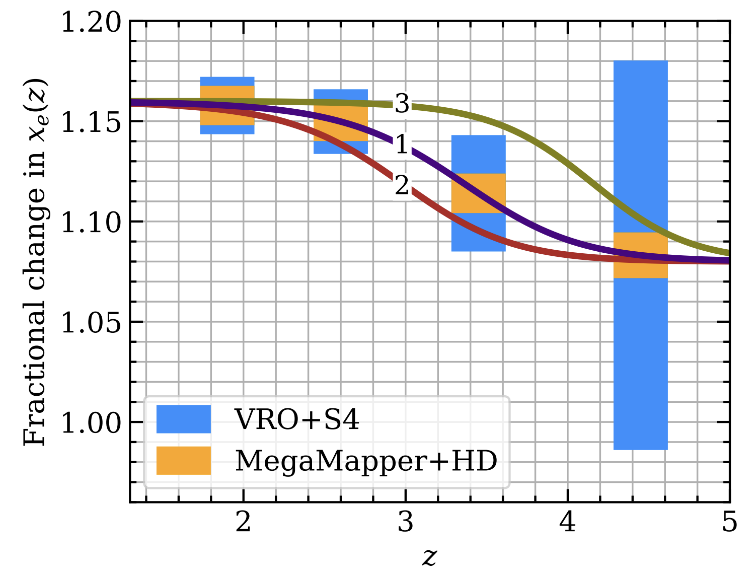 From Hotinli et al. (2207.07660). Left: Fractional change in the electron fraction during helium reionization of the three models we consider here. Here, we include forecasts for the combination of VRO and CMB-S4, and MegaMapper and CMB-HD. Right: The sensitivities on the helium reionization parameters from two survey combinations: VRO and CMB-S4 shown with blue contours, and MegaMapper and CMB-HD, shown with orange contours.