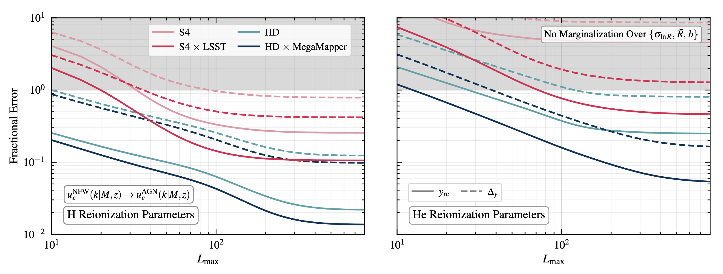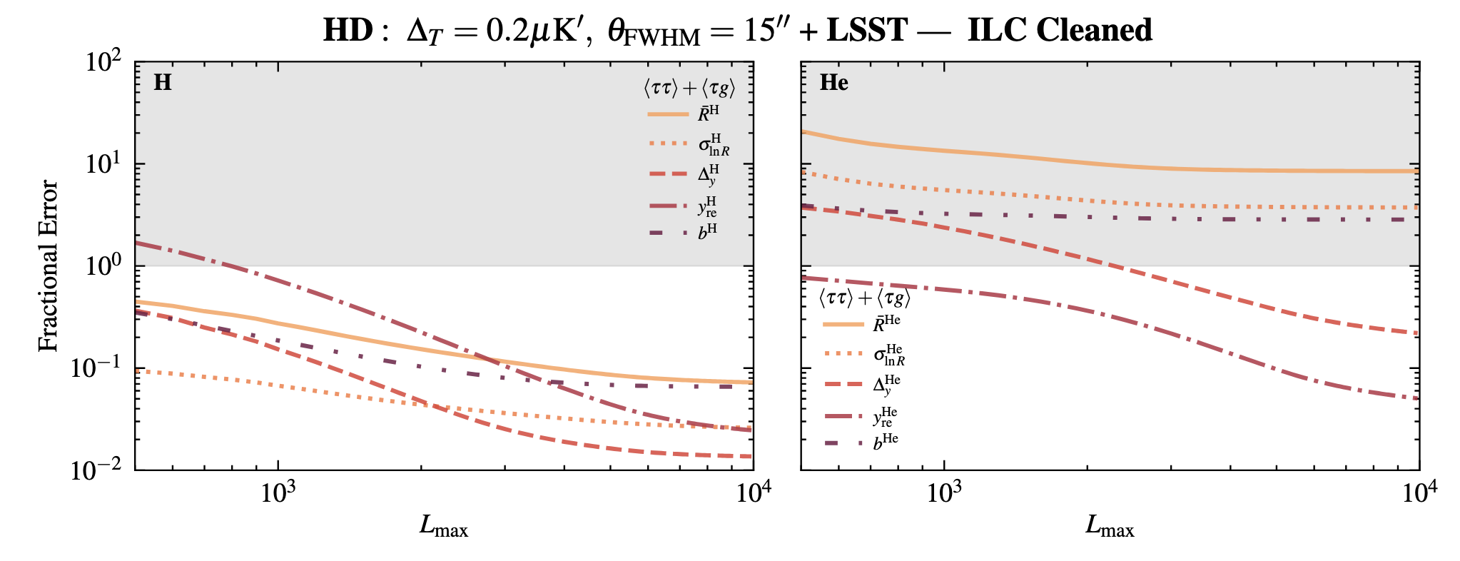 From Caliskan et al. (2312.00118). Fractional errors of helium (right panel) and hydrogen (left panel) reionization parameters from patchy optical depth reconstruction. Technique uses a four-point statistic combining CMB temperature, polarization, and galaxy clustering.