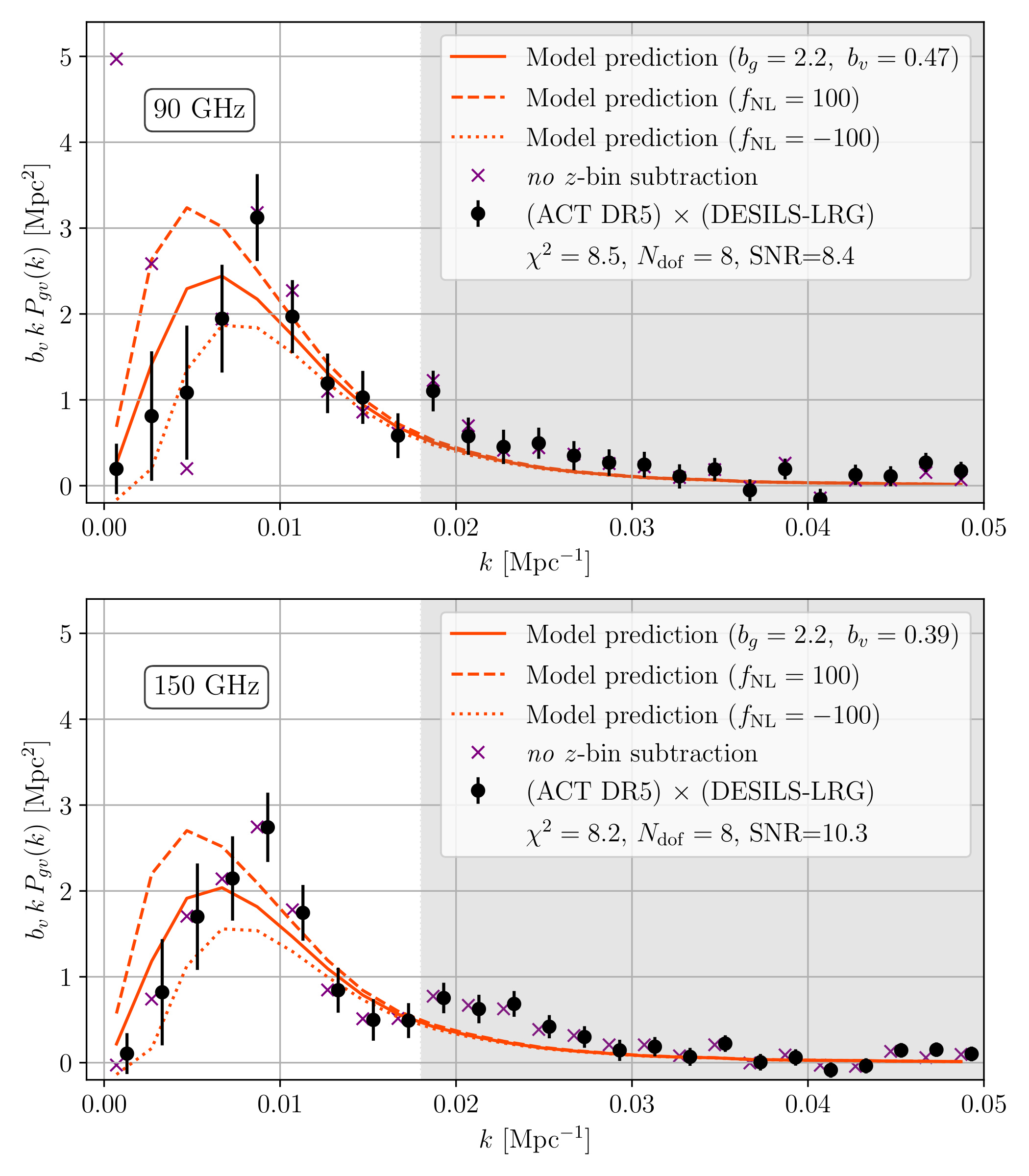 From Hotinli et al. (2506.21657). Galaxy–velocity cross-power spectra using the 90 GHz (top) and 150 GHz (bottom) CMB maps from ACT DR5 and the DESI Legacy Survey (black points with error bars). Solid red lines show model predictions in the absense of primordial non-Gaussianity. This model is a good fit over the range of scales used in this paper, delimited by the grey band. The dashed and dotted lines correspond to model predictions with primordial non-Gaussianity amplitude +/-100. The signal-to-noise ratio (SNR) is (8.4, 10.3) at (90, 150) GHz. The purple cross markers show the estimated galaxy-velocity cross-correlation obtained when omitting the mean-subtraction step described in the paper. The large difference between the black points and purple crosses indicates significant foreground contamination at 90 GHz, which is mitigated by the mean-subtraction step.