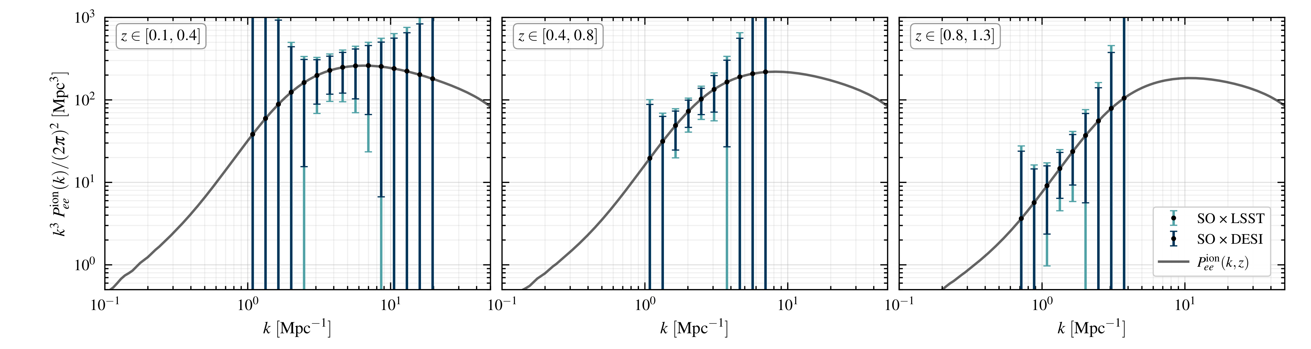 From Neha Anil Kumar et al. (2509.18249). Forecasted errors on the reconstruction of electron auto-correlation in three redshift bins of equal comoving width, ordered from lowest to highest z from left to right. The model predictions for the electron gas signal computed assuming the Battaglia ‘AGN’ model. All error bars assume CMB data from an SO-like telescope and DESI and LSST-like galaxy surveys.